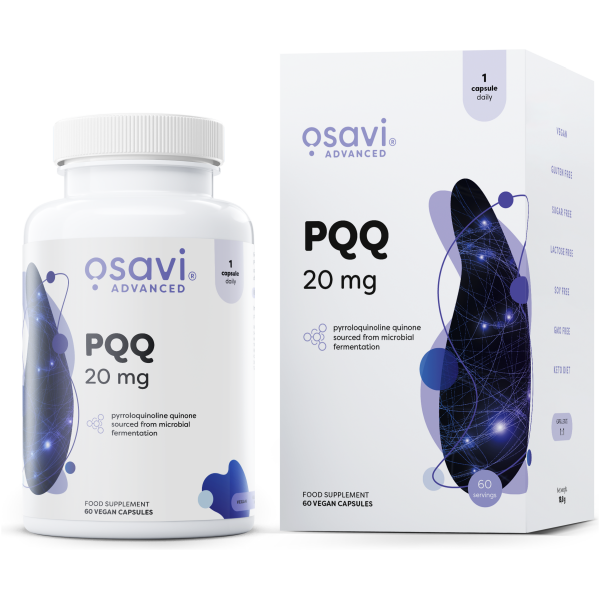 PQQ 20 mg contains pyrroloquinolinequinone, which is produced by microbial fermentation using the non-genetically modified bacterium Hyphomicrobium denitrificans strain CK-275.The food supplement PQQ from Osavi contains as much as 20mg of PQQ in 1 capsule. It contains no unnecessary additives and is suitable for vegetarians and vegans. Plus, the product is free from sugar, gluten, lactose, soy and GMOs.