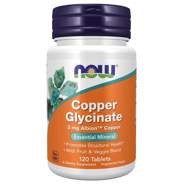 NOW Foods Copper Glycinate – 120 tabs. Promotes Structural Health* With Fruit & Veggie Blend Copper is an essential trace mineral involved in energy production, iron metabolism, connective tissue synthesis, and neurotransmitter production.* Copper is also critical for bone health, cardiovascular health, lipid metabolism, neurological health, skin health, and free radical protection.